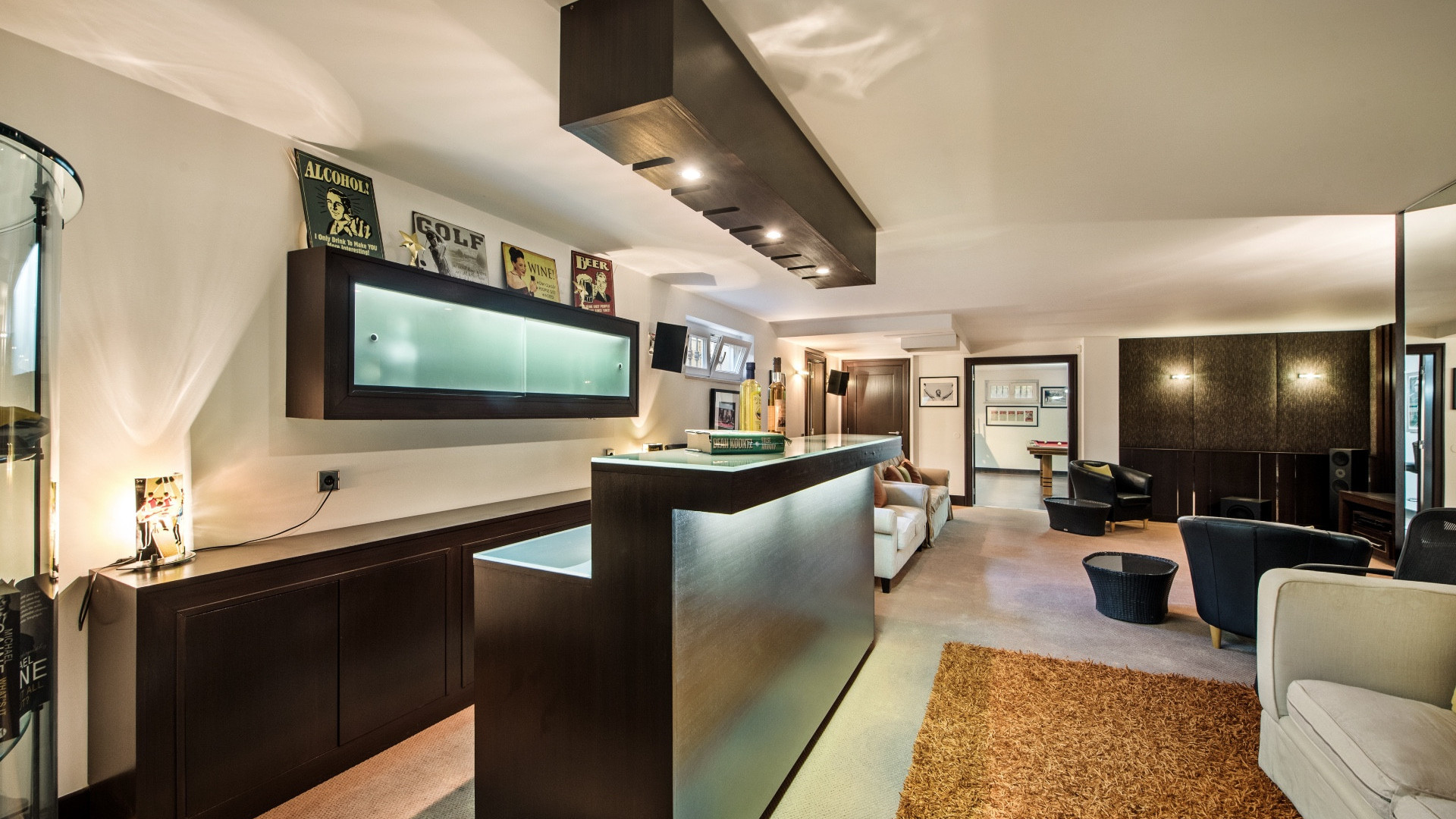Game room with snooker, football table, TV, Bar and 2 wine fridges.