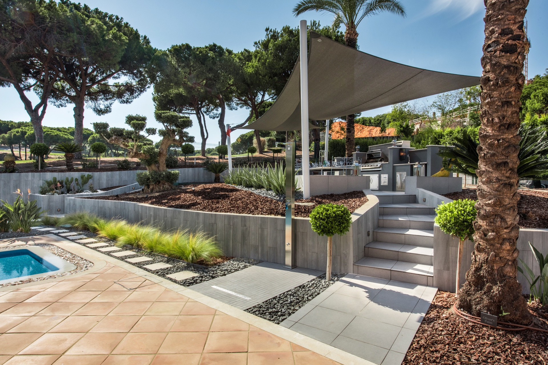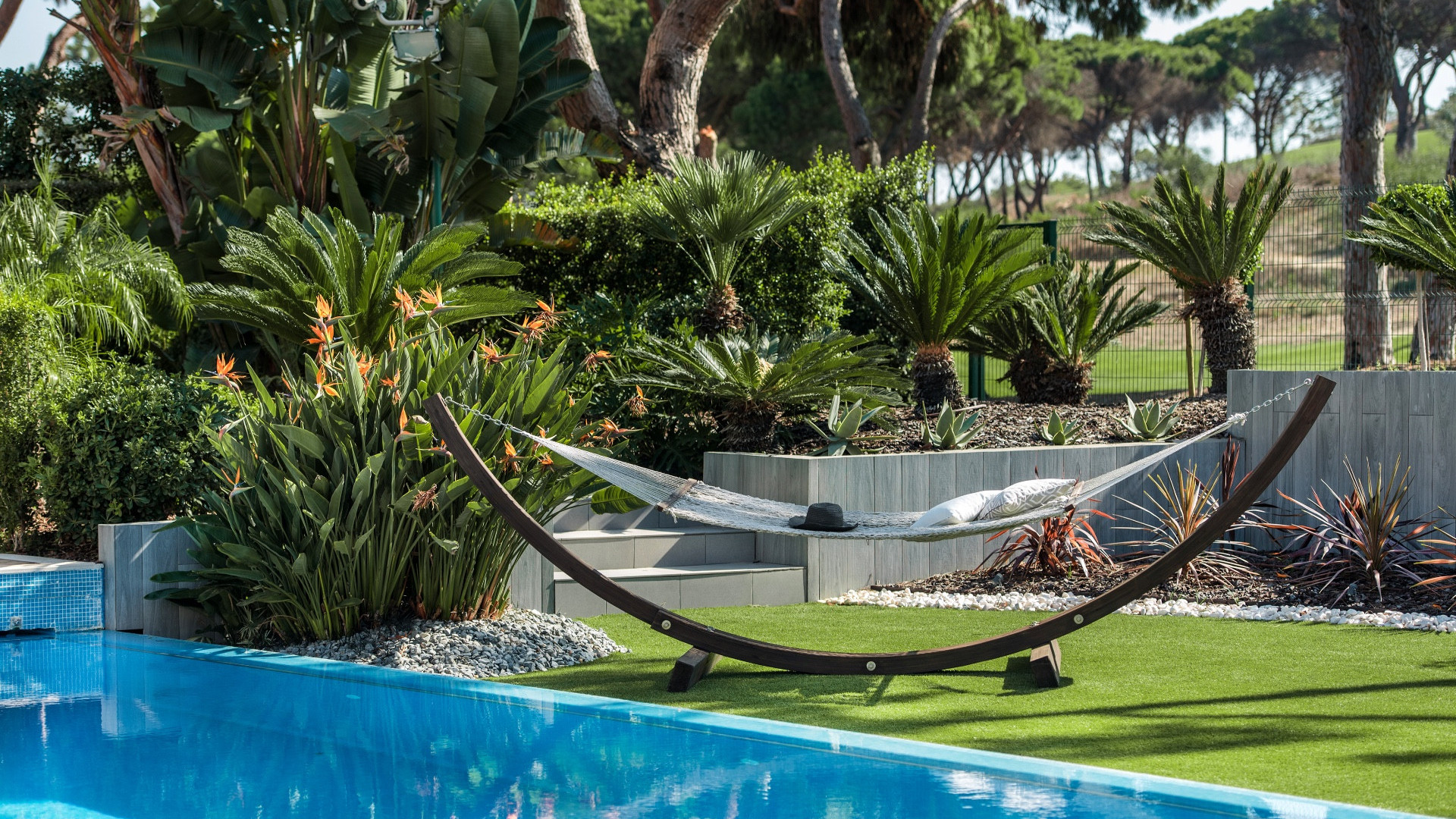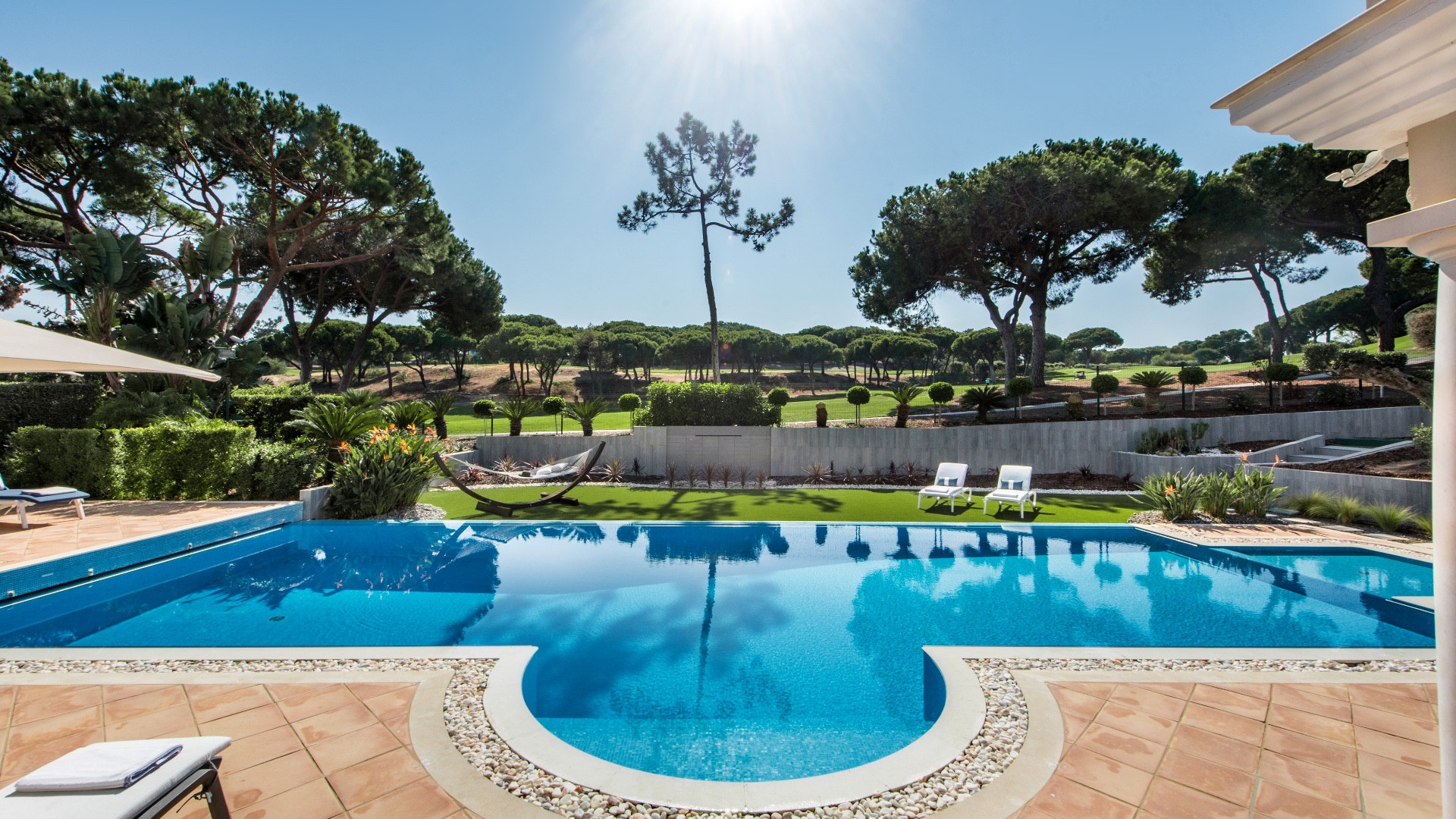 Modern villa with a vast garden and large swimming pool.